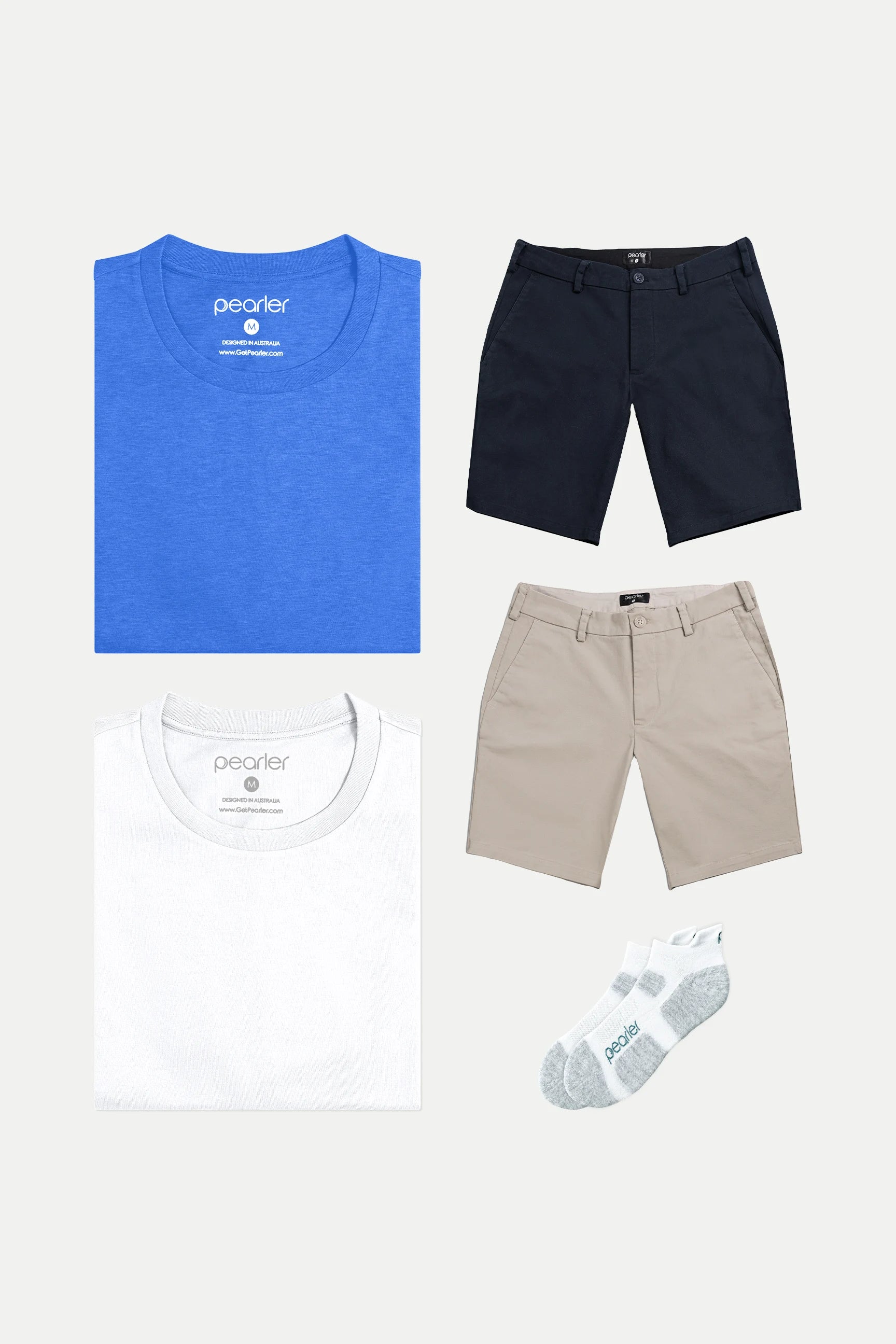 Contains: Whitsundays & Crisp White Tee, Navy & Biscuit Shorts + White Ankle Socks